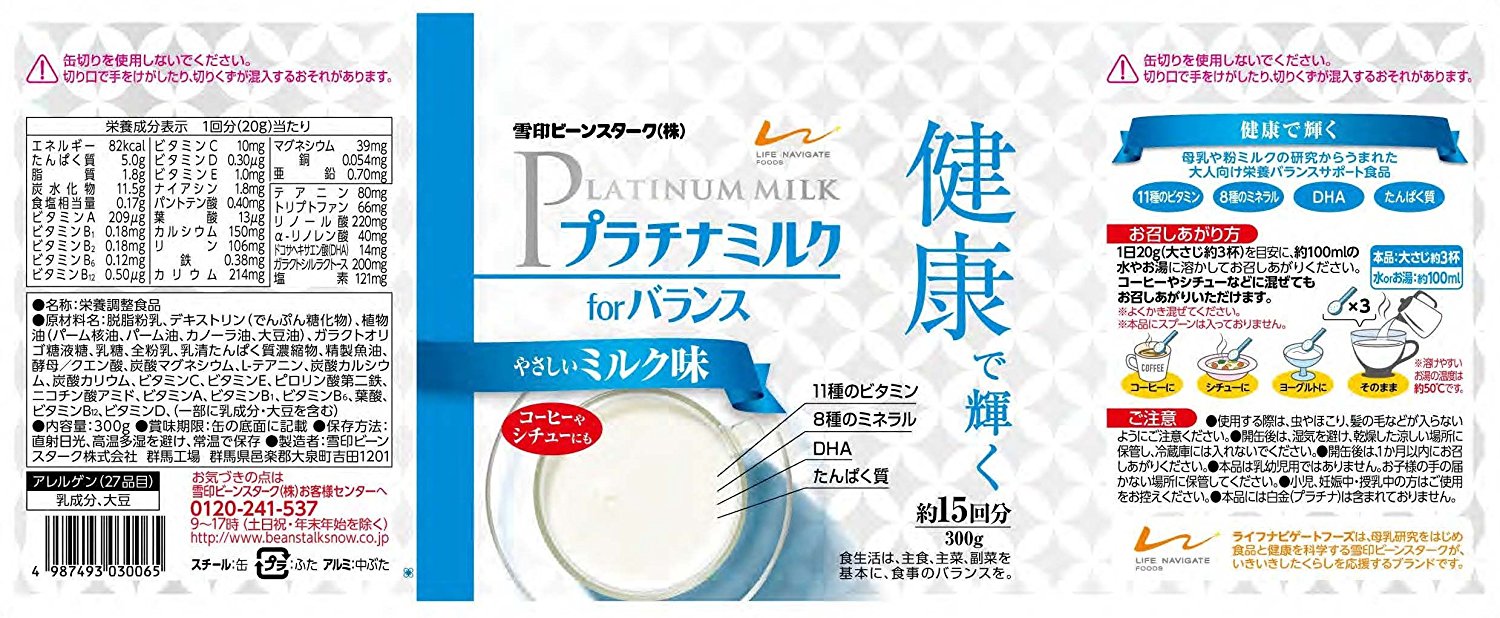 雪印ビーンスターク株式会社 プラチナミルクfor バランス やさしいミルク味 300g入缶<健康で輝く>【大人の粉ミルク】(この商品は注文後のキャンセルができません)【北海道・沖縄は別途送料必要】