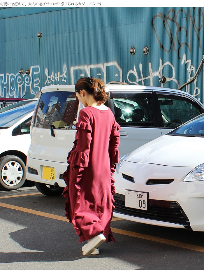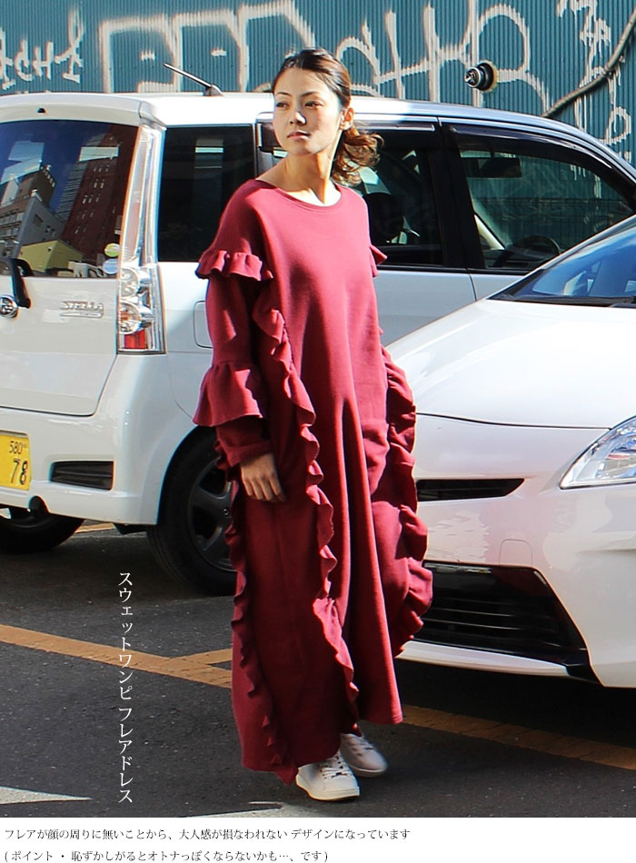 【 スウェットワンピ フレアドレス 】裏起毛 ほんわりあたたか ストール マフラーコーデに ブラック ワイン色 レディースファッション ワンピース ロング マキシ コットン トレーナー
